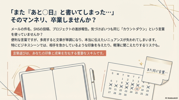 「カウントダウン」という言葉を何度も使っていると、文章がどうしてもマンネリ化してしまいますね。私自身も、メールの件名やSNSの投稿で「あと◯日!」と書き続けるうちに、もっと状況にフィットする表現はないかなと探すことがよくあります。特にビジネスの場では、あまりに煽りすぎると失礼に当たることもあって、言葉選びにはかなり気を遣いますね。