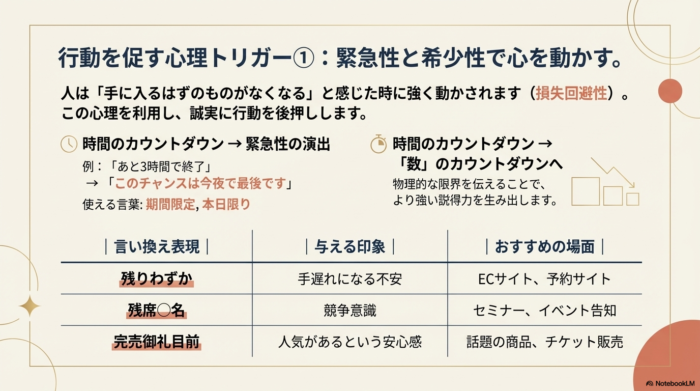 • 成約率や期待感を高めるための心理学的な言葉選び