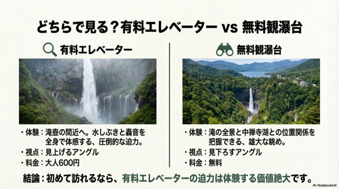 - 無料観瀑台:上から滝全体を見渡せ、中禅寺湖との位置関係も分かりやすい。