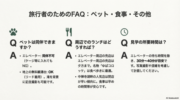 迫力はエレベーターには劣りますが、滝をバックにワンちゃんと記念撮影をするなら、無料観瀑台の方が向いているとも言えます。ペット連れの場合は無理をせず、地上エリアを中心に楽しむのがおすすめです。