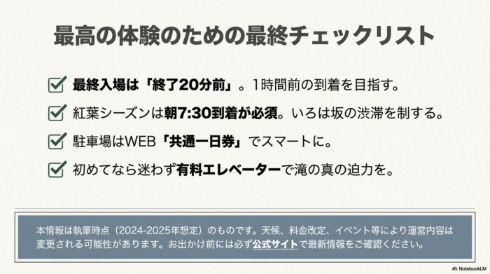 特に終了時刻ギリギリでは入場できない点と、紅葉シーズンは早朝行動が必須という点は、ぜひ覚えておいてください。事前準備をしっかり整えて、日本を代表する大瀑布の迫力を存分に味わってきてください。